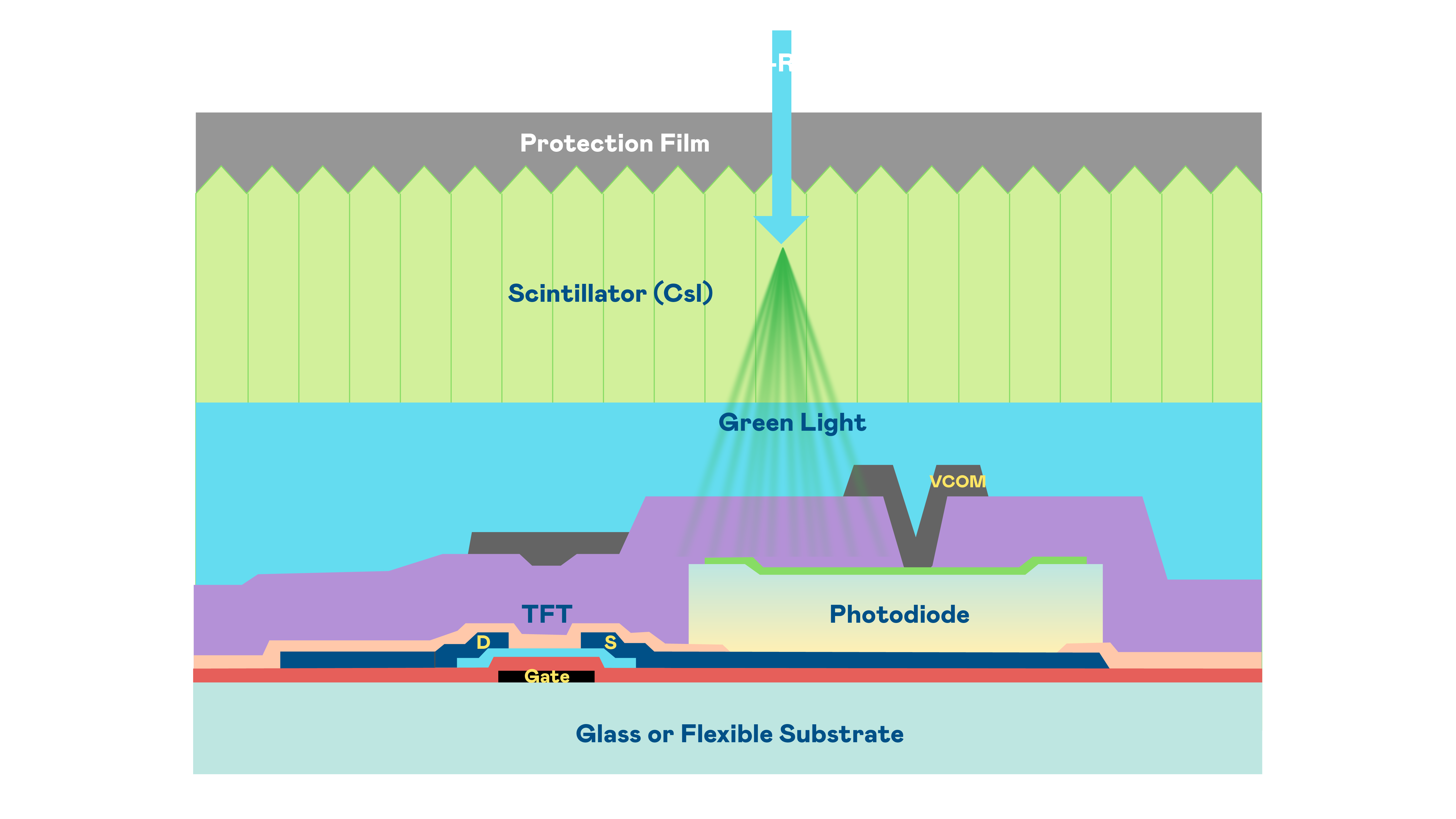 51cg.fun的X光影像感測陣列使用薄膜電晶體 (TFT) 作為每個像素的讀取開關,搭配光電二極體(Photodiode)的光電轉換元件,用以感測X光影像訊號。